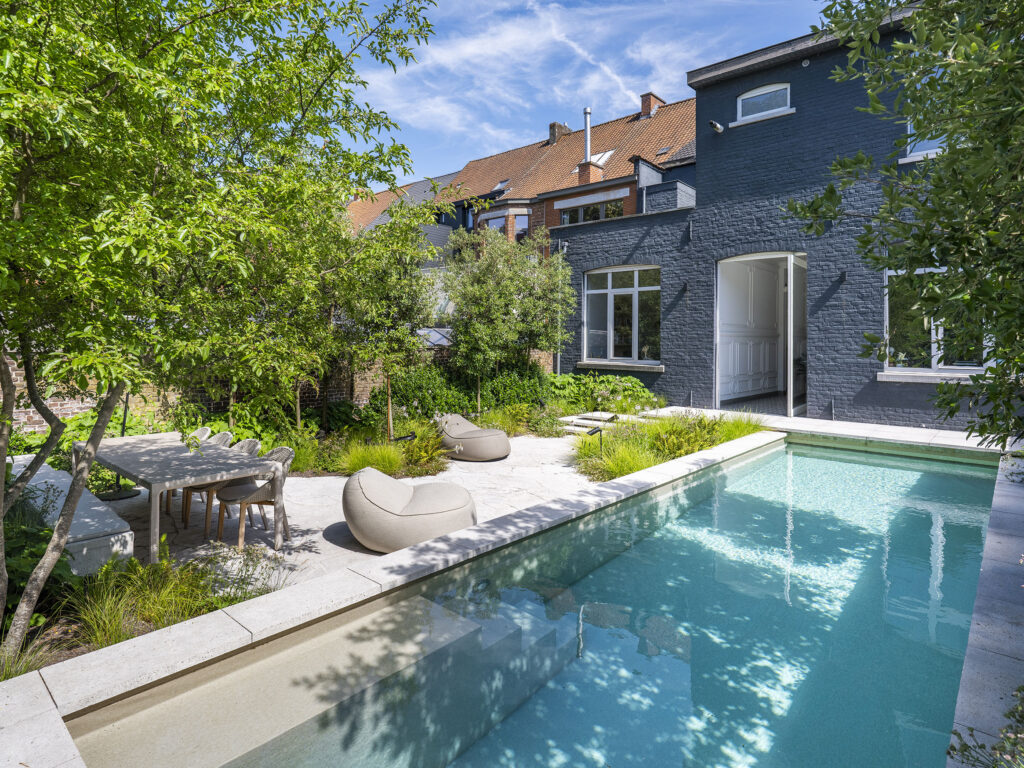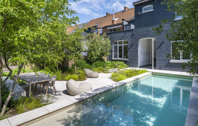 Waar deze buitenruimte vroeger bestond uit een houten terras en verharding, zorgden tuinaannemer Stijn Phlypo…