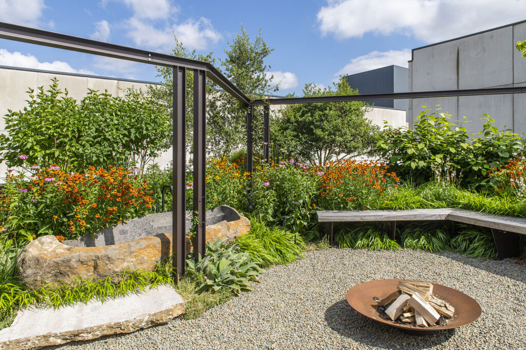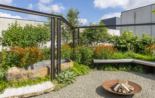 De eens troosteloze, nagenoeg volledig verharde tuin aan het bedrijf van Groenvoorziening Hommé, is door Mathias Hommé en de zijnen getransformeerd tot een charmant stukje groen. Oorspronkelijk was het perceel volgebouwd met typische Vlaamse koterijen. Die hebben gelukkig plaatsgemaakt voor een echte belevenistuin met een houtgestookte hottub, buitendouche en vuurschaal.