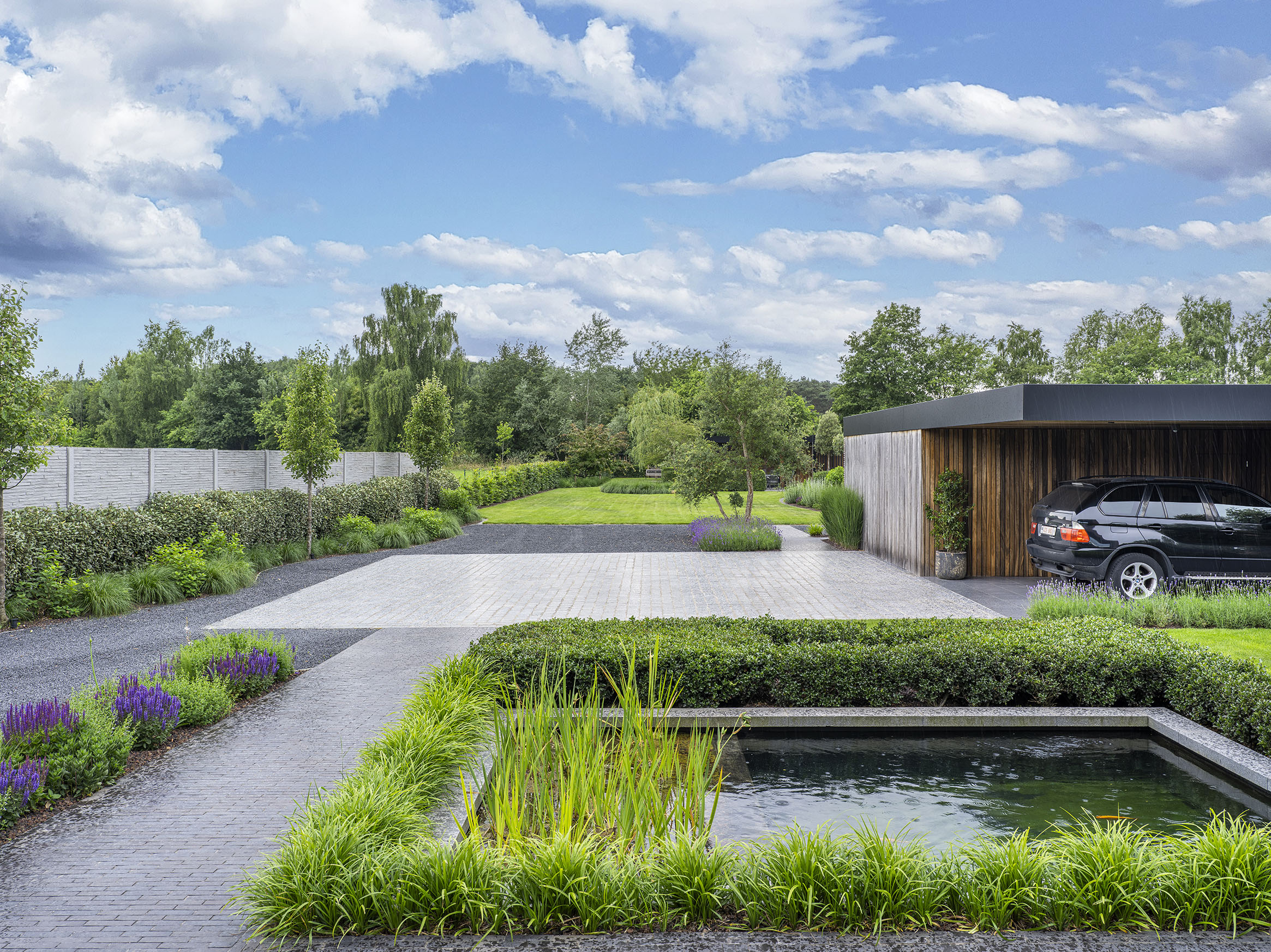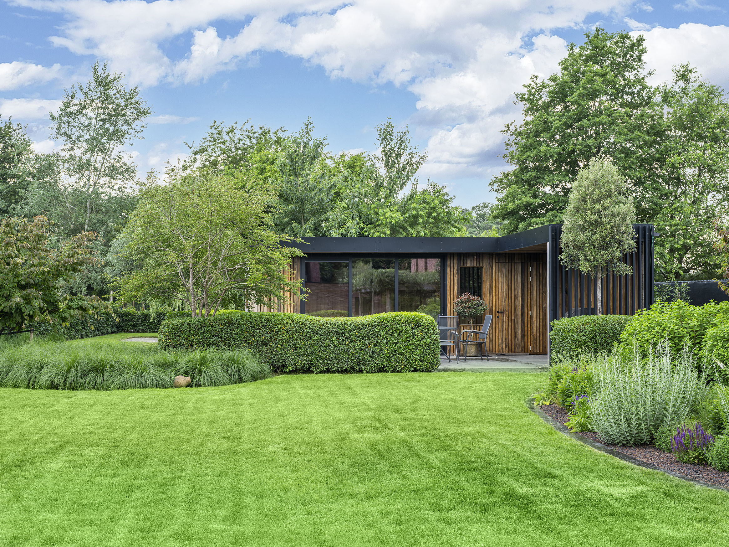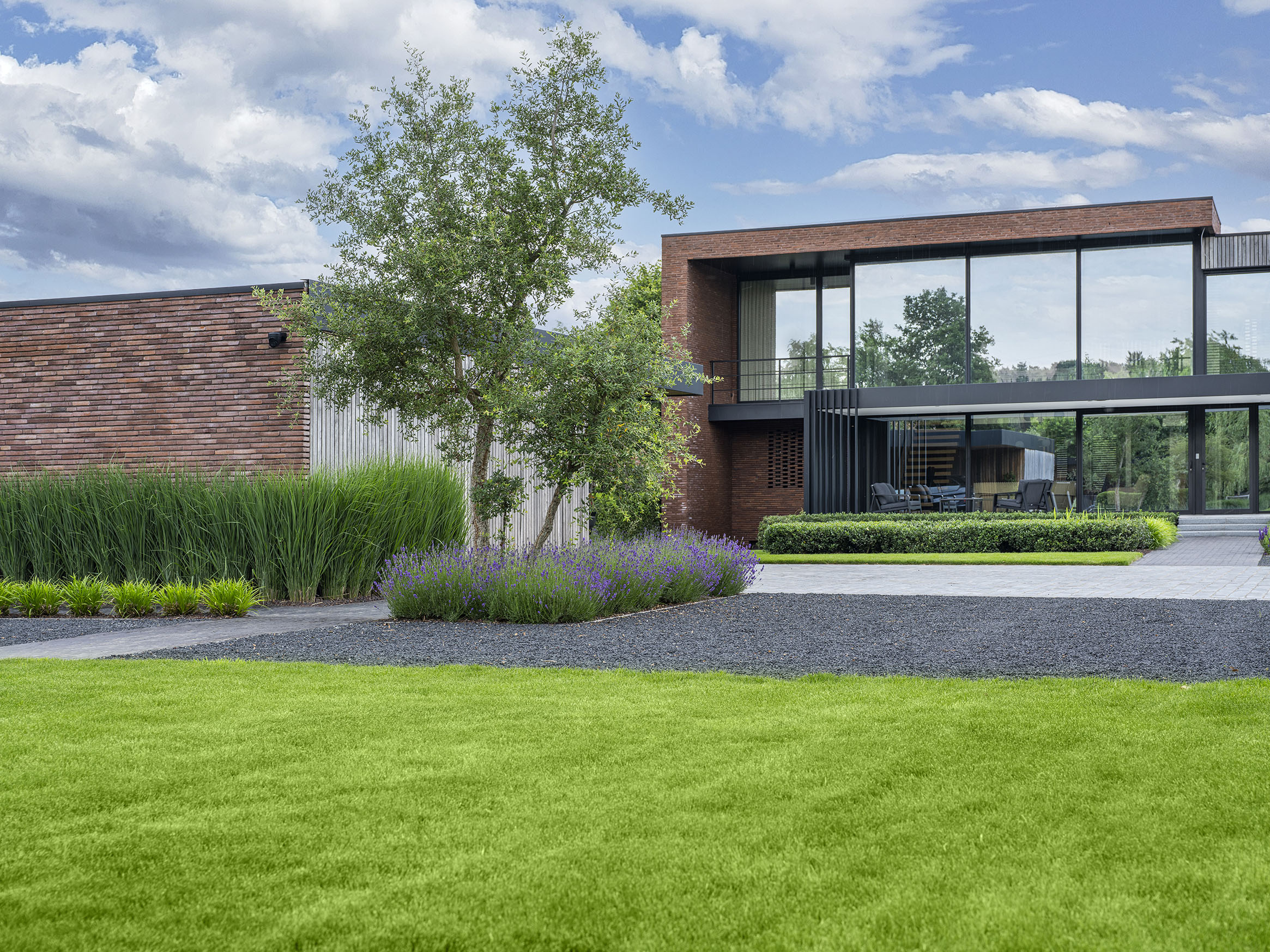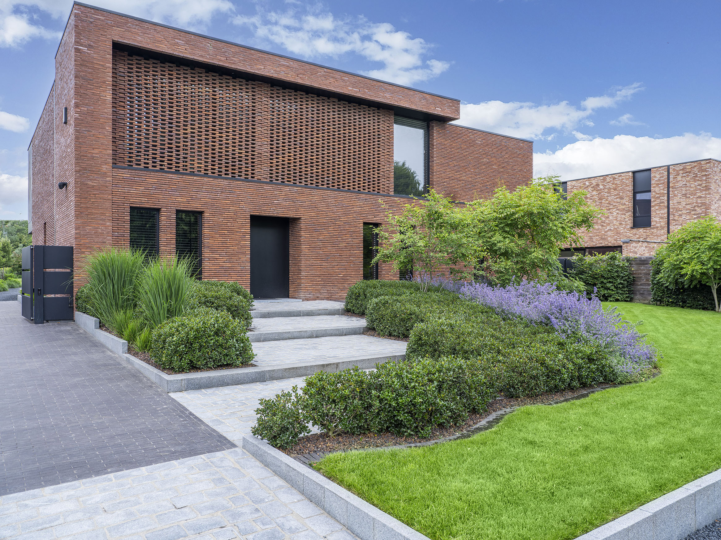 Deze strakke, moderne villa in Hechtel-Eksel vroeg om een uitnodigende tuin. Niet alleen uitnodigend voor familie en vrienden, maar ook voor bijen, vlinders en andere insecten. Tuinaannemer en -architect Wim Beliën koos voor een hedendaags ontwerp met groene wolkmassieven, levendige borders, duidelijke lijnen en een verrassend ‘romantisch’ einde. Want achterin de tuin, in een verborgen hoekje, staat een treurwilg waaronder de eigenaar graag even gaat zitten om te contempleren.